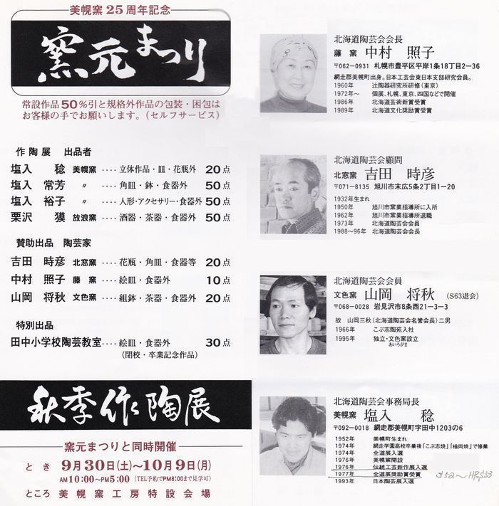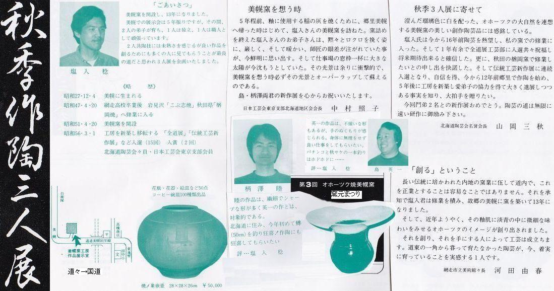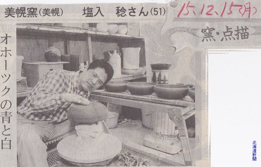 オホーツク焼の食器や花器は青色が基調。 火山灰が原料のるり釉(ゆう)と稲の灰釉を使う「るり釉白流し」の技法である。 藍(あい)や青はオホーツク海、白が雪と流氷というイメージは初めは意識してなかった。 でも お客様がそう見てくれて、オホーツク焼の名も広まった。 網走の高校時代に陶芸に手をそめ、卒業後は岩見沢・こぶ志窯と秋田県の窯元で修業。 1976年、郷里の網走管内美幌町に戻り独立した。 |