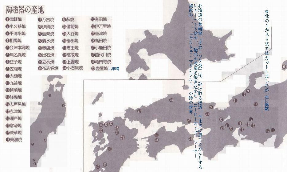 やきものの種類 おおまかには土器・陶器・b器(せっき)・磁器の4つに分けられます。 土器;粘土を素地(きじ)とした多孔質で,無釉のものを土器といいます。 焼成温度は1,000度未満で,旧石器時代より世界各地で作られています。 陶器;多孔質で吸水性のある素地に施釉した焼物です。 b器(せっき);素地に気孔性がなく不透明で,有釉,無釉のものがあり, 素地は粘上で,普通は1,250度内外で焼成されます。 備前,伊賀,信楽,常滑,万古,益子等が産地。 磁器;日本では土ものに対して,石ものとして磁器を区別しています。 素地は白色で,半透明か透明に近く,有釉のものがほとんどです。 素地は硬度が高く,吸水性がありません。 産地は有田とその周辺,瀬戸とその周辺, 多治見,京都,九谷,砥部等。 |